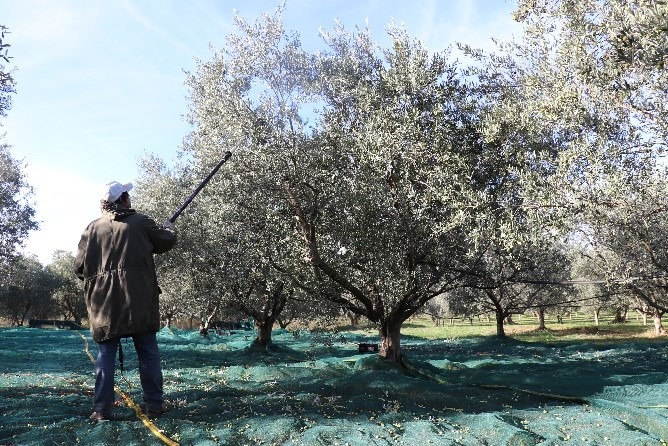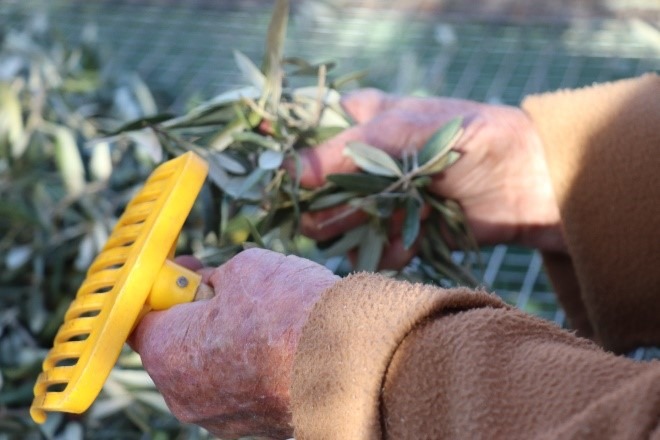 La récolte des olives peut être faite à la main (pâturage), à l’aide de peignes, ou au battement ou à l’aide de machines spéciales qui « secouent » l’olivier pour faire tomber les olives dans un filet de récolte.