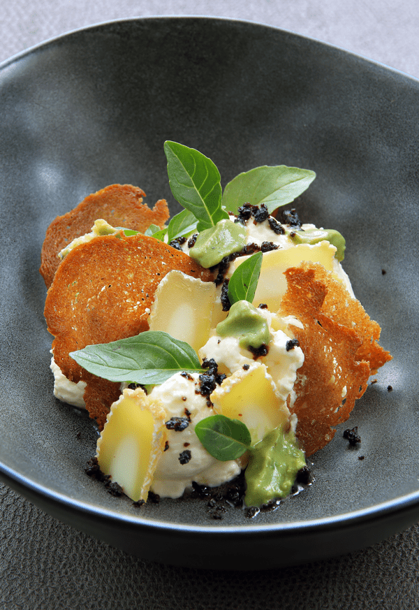 Il s’agit d’une création fromagère qui permet de découvrir deux types d’affinage de Picodon différents. Le Picodon est mis en valeur par l’huile d’olive de Nyons AOP ainsi que la poudre d’olives noires de Nyons AOP qui va également apporter du croquant. C’est une belle transition du sale vers le sucre, toute en fraîcheur.