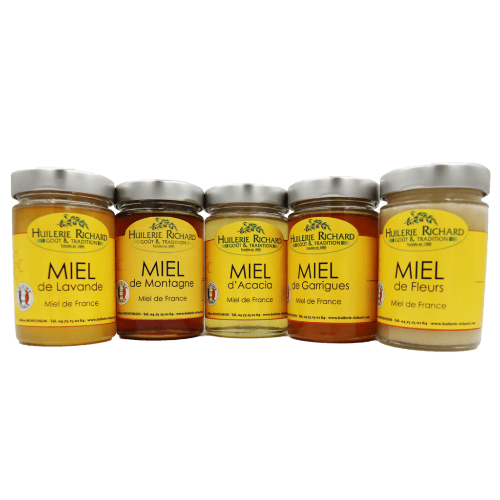 Les miels se caractérisent par leurs différentes confections. Chaque fleur donne un goût particulier mais il existe aussi des miels produits à partir de plusieurs fleurs comme le miel de montagne ou le miel de fleurs.