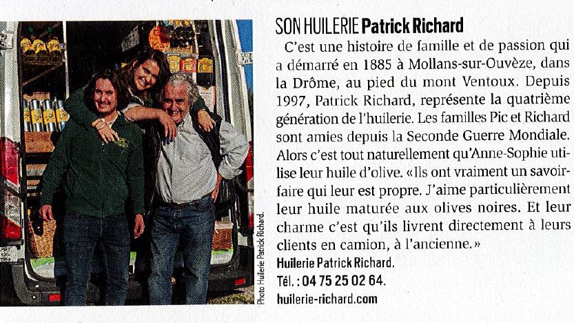 C’est une fierté pour l’Huilerie Richard d’apparaître dans les recommandations d’Anne-Sophie Pic, la célèbre cheffe étoilée de Valence, dans un article publié par Paris Match le 14 novembre 2024. Véritable ambassadrice de la gastronomie française, Anne-Sophie Pic partage ses meilleures adresses, et parmi elles figure l’Huilerie Richard, symbole d’un savoir-faire familial et artisanal unique en Drôme.