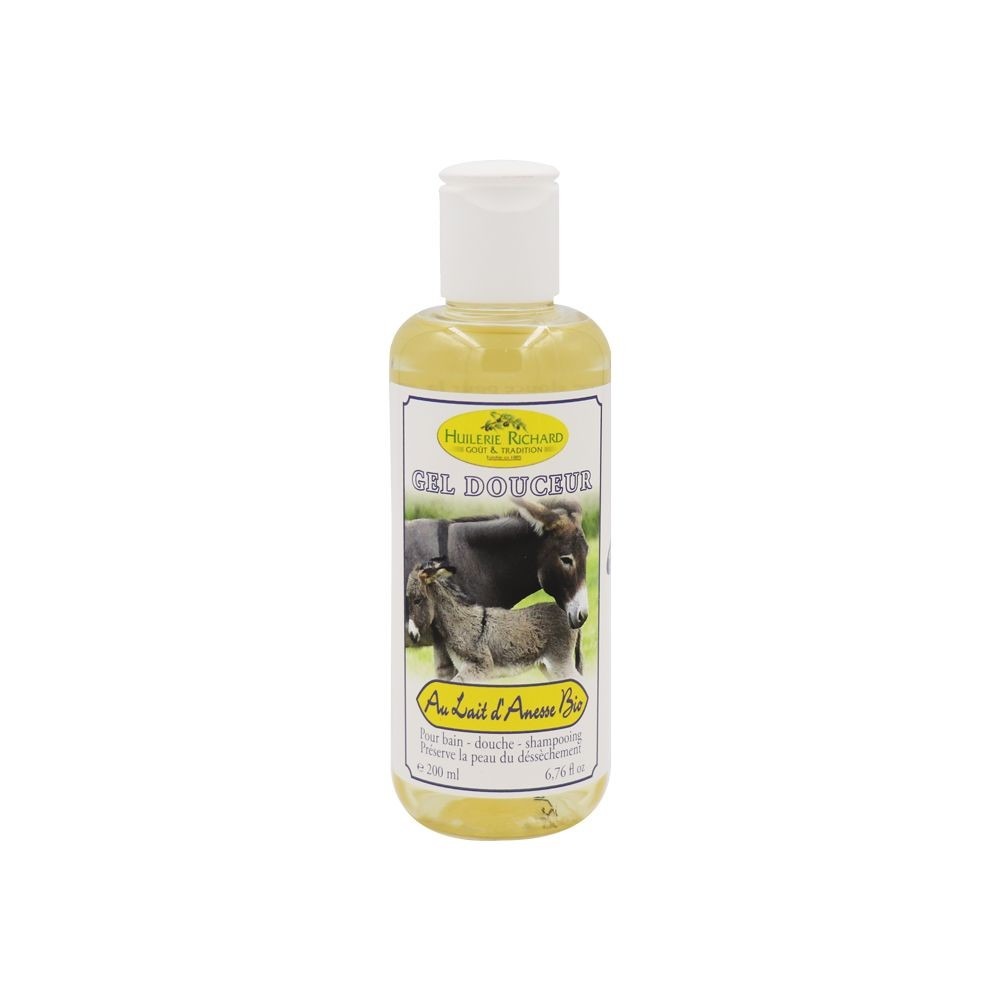 Ce gel douche au lait d’ânesse bio est une base lavante douce pour la peau et les cheveux.