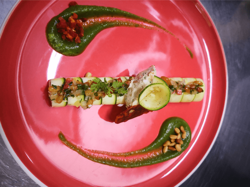Cannelloni de courgette, caviar d’aubergine, huile d’olive de Nyons et chorizo