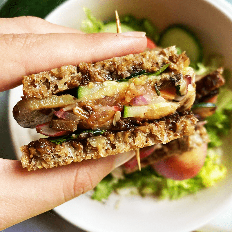 Le vegan club sandwich au confit d’olives noires au gingembre