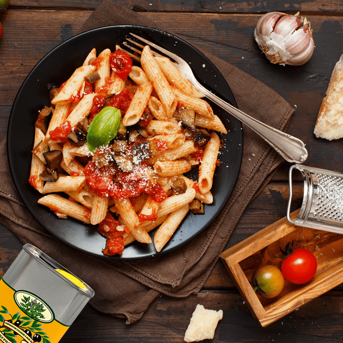 Pâtes à la tomate et préparation à base d’huile d’olive au basilic