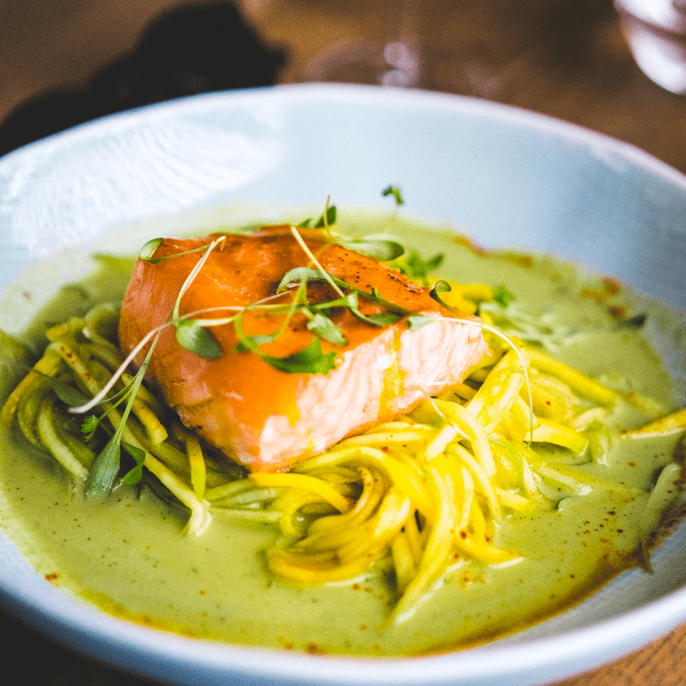 Pavés de saumon et spaghettis, sauce courgette et chèvre
