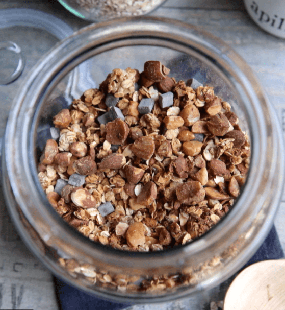 Vous n’avez plus qu’à mettre votre granola maison aux pépites de chocolat dans une boîte hermétique ou un bocal en verre pour le conserver.