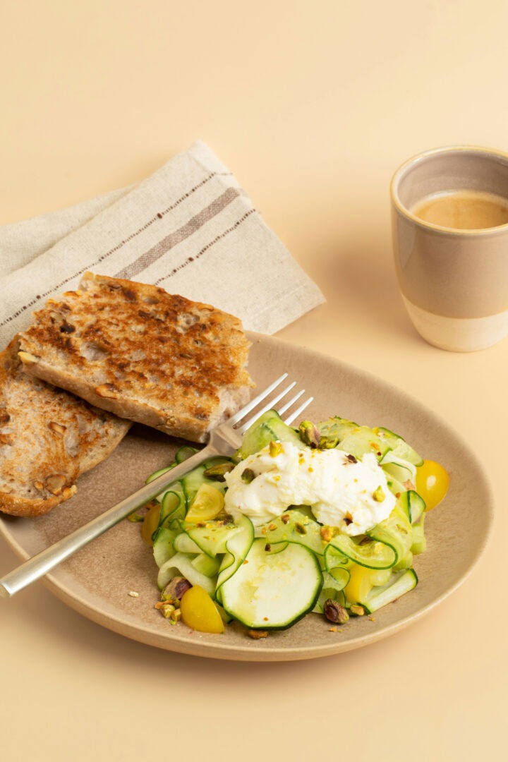 Salade de courgette, stracciatella, pistache et tomates cerises