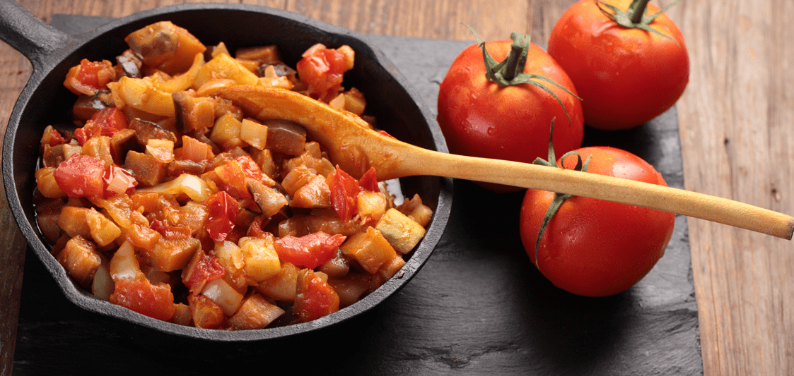 • Dans une poêle, ajoutez un filet d’huile d’olive et faites revenir les oignons. Une fois dorés, versez l’aubergine et laissez cuire pendant 15 min. Ajoutez ensuite la courgette pendant 10 min et terminez par la tomate.