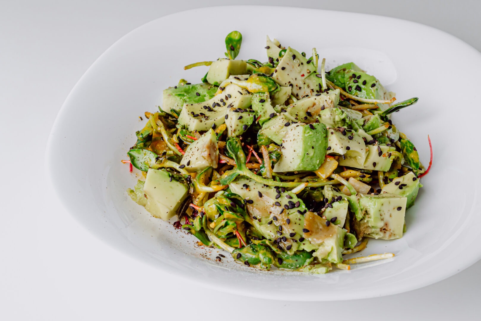 • Servez votre salade de pousse de lentille, d’avocat et de concombre à l’huile d’olive, vinaigre à la pulpe de poivron et piment d’Espelette et aux graines de sésame bien frais et dégustez !