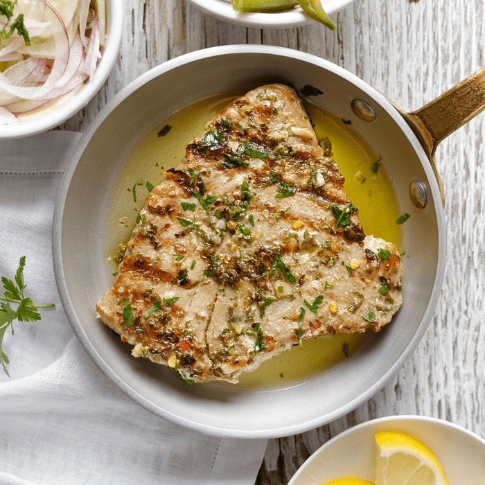 – Videz la poêle des oignons sans la nettoyer. Salez avec une pincée de fleur de sel sur chaque côté du steak de thon. Posez le thon dans la poêle chaude, laisser cuire à feu moyen environ 4 minutes. Lorsque le thon devient légèrement gris sur un tiers de la hauteur, le retourner et le laisser cuire de l’autre côté environ 4 minutes.